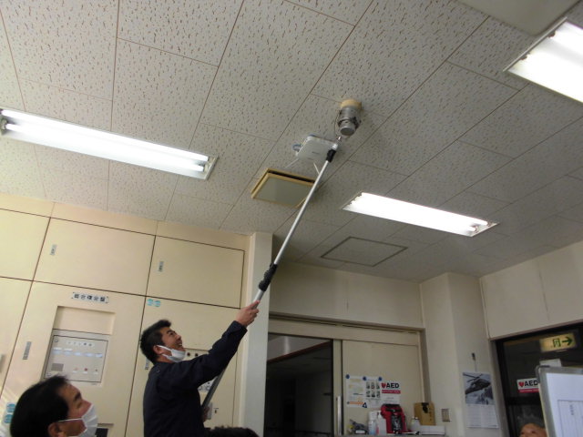 訓練は、スマートフォンによる119番通報訓練、避難誘導訓練、非常用放送設備(火災報知器・火災受信機等)